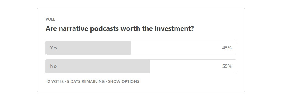 You had some valid points but I didn't agree with the conclusion. Sweet Bobby was transformative for Tortoise here in the UK, and they're now audio-first with a mix of narrative and interview shows. Some of our Publisher Podcast Award winners do narrative shows pretty cheap and say the listener numbers are better, and they have more longevity. History Extra does their narrative series in their main feed but releases them to subscribers first. As with all things, a mix is good. Narrative series can enhance a more routine podcast schedule but there's no good binning everything and going all in on them.