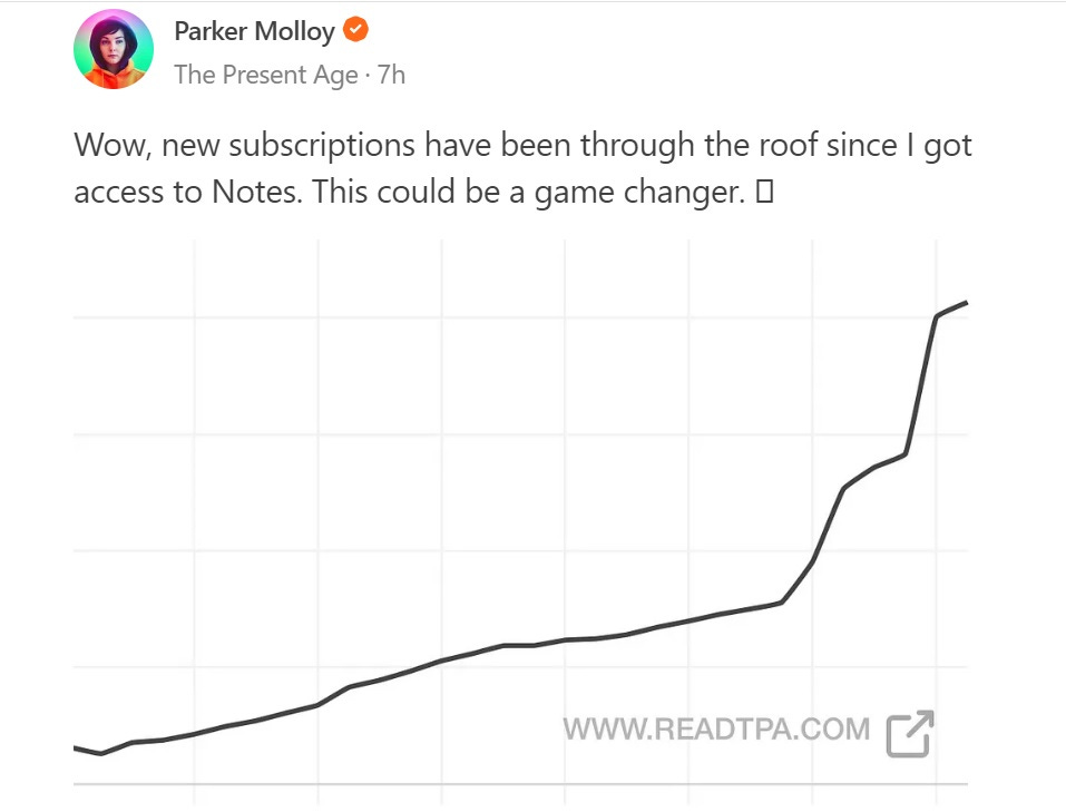 Substack Notes represents a huge leap forward in enhancing those network effects. Before its launch, Substack only served as a platform for longform content — i.e., newsletters — which meant that creators still needed to turn to outside networks for posting their shortform content. Now, the two mediums have merged in such a way that will ultimately benefit creators. After all, when someone subscribes to my Substack Notes, they also become subscribers to my newsletter. That requires a lot less friction than trying to lure my Twitter followers over to my newsletter signup page. In just the two days since Notes launched, several writers have reported that they’ve seen their biggest jump in subscribers since joining Substack. I’ve noticed a significant bump as well.